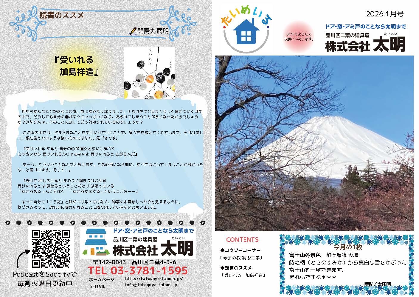 2026.01.13 2026年1月のたいめいる発行しました Post いつも太明のホームページをご覧いただき、ありがとうございます。 本年も太明をよろしくお願いいたします。 2026年1月のたいめいるが完成致しましたので、ご覧ください。 Post 年末年始休業のお知らせ 最近のお知らせお知らせ一覧 2025.12.17 年末年始休業のお知らせ 2025.12.02 2025年12月のたいめいるを発行いたしました 2025.11.04 2025年11月のたいめいるを発行しました 2025.10.07 2025年10月のたいめいる完成いたしました 2025.04.22 ゴールデンウィーク期間( 4 月 26 日 ~ 5 月 6 日)の営業スケジュールのお知らせ 2025.04.08 4月10日は”よい戸の日” 2025.04.01 たいめいる再開のお知らせ