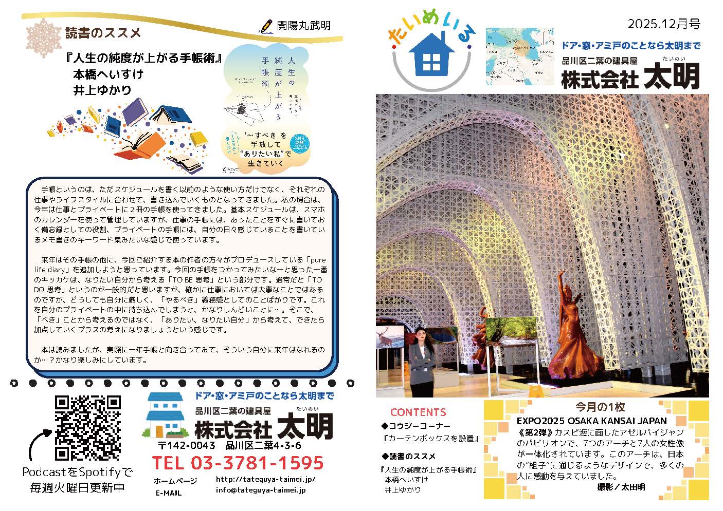 2025.12.02 2025年12月のたいめいるを発行いたしました Post いつも太明のホームページをご覧いただき、ありがとうございます。 2025年12月のたいめいるが完成致しましたので、ご覧ください。 Post 2025年11月のたいめいるを発行しました 年末年始休業のお知らせ 最近のお知らせお知らせ一覧 2025.12.17 年末年始休業のお知らせ 2025.11.04 2025年11月のたいめいるを発行しました 2025.10.07 2025年10月のたいめいる完成いたしました 2025.04.22 ゴールデンウィーク期間( 4 月 26 日 ~ 5 月 6 日)の営業スケジュールのお知らせ 2025.04.08 4月10日は”よい戸の日” 2025.04.01 たいめいる再開のお知らせ 2024.12.16 年末年始の休業日のお知らせ